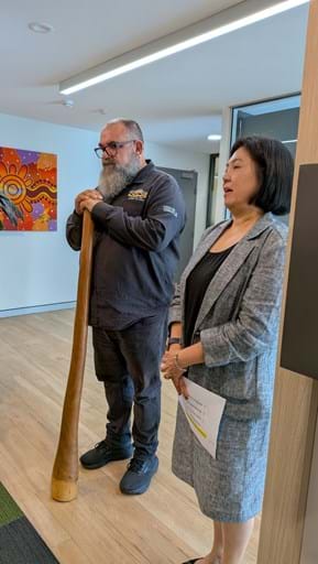 The FSCT visit began with a Welcome to Country ceremony and a didgeridoo performance by Brendan Kerin from the Metropolitan Local Aboriginal Land Council, offering a meaningful introduction to the deep cultural heritage of Gadigal Country.