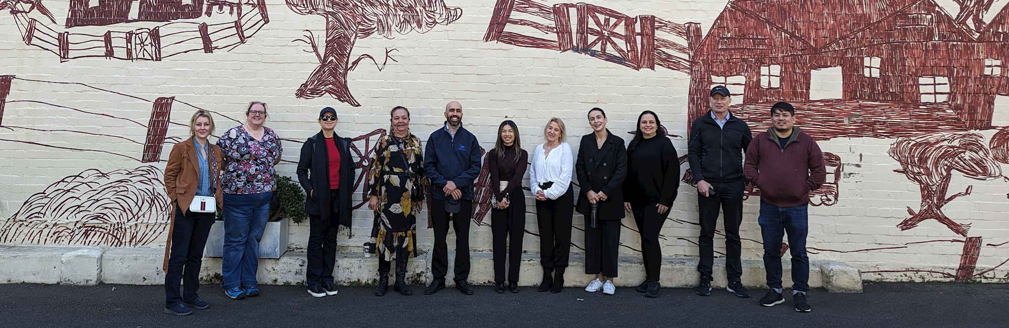 We visited the "Tin Humpy" mural by Danny Eastwood and the "Mission Boy Dreams" mural on the Wyanga Aboriginal Aged Care building, based on an etching by Wiradjuri artist Roy Kennedy that portrays his memories of the Warangesda Mission in the Riverina. Our next stop was the Gadigal Information Service building, where we admired the mural of Aunty Sylvia Ingram Scott, Uncle Sonny Edwards, and Aunty Mary Silva, founders of the Wyanga Aboriginal Aged Care Program and esteemed Redfern legends.